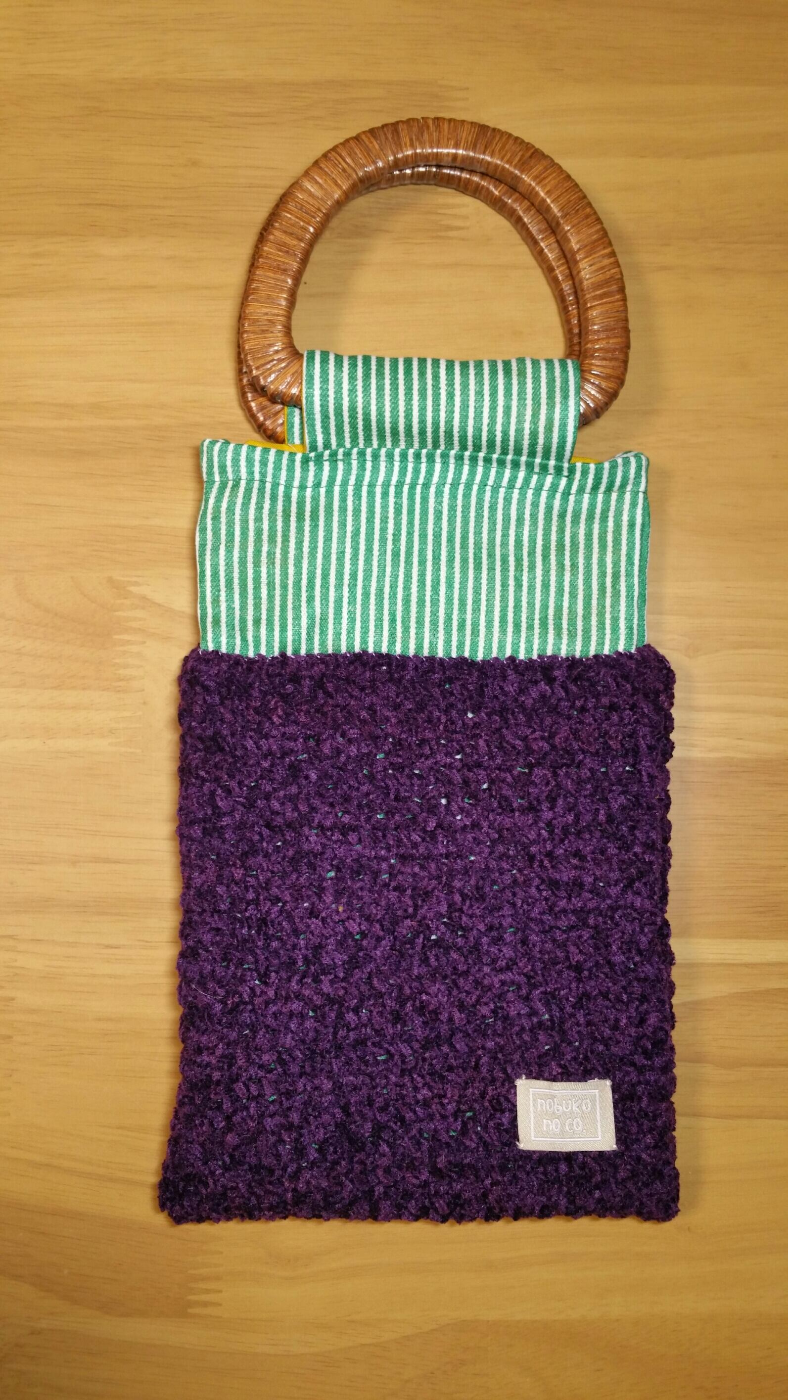 緑のストライプ生地に紫のモールヤーンで編んだ編み地を被せました。